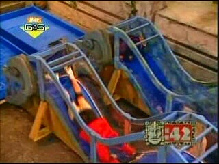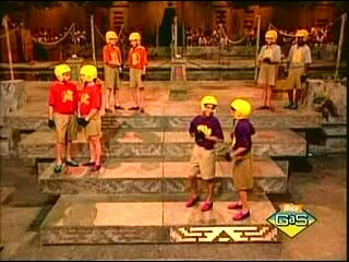 Temple GamesThe Purple Parrots are 13-year-old Mike, who plays baseball (bats 0.396), but never got any home runs, and 12-year-old Andrea, who wants to play for the Olympic basketball team. The Red Jaguars are 13-year-old Joe, who plays junior varsity football, and 14-year-old Gaby, who plays the piano. Assemble the Fleet (Dragon Tunnel) When Philip of Spain sent his mighty fleet of ships to invade the English, Elizabeth had to quickly summon her own fleet to hold them off. Before the teams were two ocean waves with a ship in each trough. When Kirk gave the signal, they pull themselves over the waves to the first troughs, attach the first ship to their helmet. Then they went to the next ones, stuck those to their helmets. Then they turned around, they came back and they did the same thing again. They went like that for 60 seconds. The first play to get back with six ships on their heads or the player with the most ships on their heads when time was up wins. Mike had six ships on his helmet - but was not back yet - when time elapsed, while Joe only had four. Tower of London (Peanut Shaft) When Elizabeth was young, two things happened to her: she was imprisoned in the Tower of London, and she lost all of her hair. They combined those two events in that game. At the base of their towers were several wigs and at the top several heads. When Kirk gave the signal, each player grabbed a wig, climb to the top of their towers, and placed their wigs on one of the heads. Then they climbed back down and grabbed another. The first player to get four wigs onto the heads at the top of the tower in one minute won. Obviously, no team won; Gaby and Andrea tied at three apiece. St. George's Cross (Bungee Soap Line) Today, the English flag is called the Union Jack. When Elizabeth was queen, it was called Saint George's cross. The players were going to make one. One player from each team started with a piece of flag on their heads. And when Kirk gave the signal, both partners pulled themselves to the center. When they got there, they passed pieces of the flag from one player's helmet to their partner's. Then they slid back to their starting points. The first partners grabbed another piece of the flag while the second partners placed their pieces in the correct upright position. Then they pulled themselves to the center and did it again. The team with the most correctly placed pieces of flag at the end of one minute won. The Purple Parrots only placed one piece on the board, and it was discounted due to the fact that the flag side was not facing outward. The Red Jaguars placed four pieces on the board. Despite the fact that only one piece was placed properly, it was still enough to win the game and the full pendant, sending the Red Jaguars to Olmec's Temple in search of the golden ship with 1½ pendants.