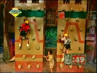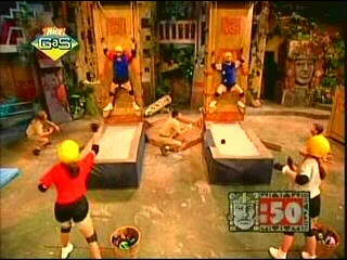Temple GamesThe Red Jaguars are 14-year-old Steve and 13-year-old Lisa. The Silver Snakes are 14-year-olds Rodney and Lesley. Decorate Alhambra (Climbing Wall)[] The Alhambra Palace was famous for its beautiful tile decoration. When Kirk gave the signal, Lisa and Lesley each had to grab a tile from their baskets, stick it to their shirts, climb up, and place it on the green velcro pad at the top of the wall. The player with all four tiles in their correct positions or the player with the most correctly placed tiles in 60 seconds won. Lesley was consistently ahead of Lisa and she was able to place all four tiles and make it down on the ground just before time expired, earning her the half Pendant of Life. Keys in the Locks (Bungee Soap Ramp)[] According to legend, when Isabella ran through the Alhambra, she tried the keys on all the doors. Here, Steve and Rodney had to try three keys in one door. When Kirk gave the signal, each player had to grab a key, attach it to his helmet, pull himself up the ramp, and insert the key into one of the three locks. The player to insert all three keys in 60 seconds won. Although both boys started out evenly, Steve fell behind after struggling to hang on to and eventually losing his grip, twice, on the hand grip straps at the top of the ramp slowing his progress, as he was on his way up the ramp to insert his second key, which he also had problems doing. Rodney inserted his third key with 14 seconds remaining, earning him the half Pendant of Life. Boabdil vs. Isabella (Velcro Ball Toss)[] Boabdil was a great warrior, but he met his match in Isabella. Here, the male players would represent Boabdil, while the female players would represent Isabella. The male players had to stand on the platforms while their partners had to throw colored plastic velcro balls at them. The male players had to catch the balls on their dark blue velcro shirts. The player with the most balls on her partner's shirt in 60 seconds won. The Red Jaguars won the game and the full pendant after landing fourteen balls while the Silver Snakes only landed twelve balls. Tiebreaker[] Kirk: "Is the Alhambra in the city of: Madrid, London, or Granada?" Rodney from the Silver Snakes rang in answering "Madrid". Unfortunately, it was not the correct answer, and therefore the Red Jaguars had automatically won and are heading to Olmec's Temple in search of the keys. The correct answer was Granada.