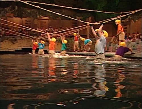 Temple GamesThe Red Jaguars are 13-year-old Bobby, who wants to be rich (saying he could be a doctor or a lawyer - if he were a doctor, he would work on the heart), and 12-year-old Brittany, who babysits four siblings. The Green Monkeys are 12-year-old Melissa, who plays the flute, and 12-year-old Phillip, who likes moving around while playing sports. "Drat, That Zulu Drought" (Bucket Ramp)[]In the days of Shaka, the Zulus were farmers and raised cattle, and during times of a drought, they would travel great distances for water. Fortunately, Bobby and Melissa had to climb the ramp for water. At the top of the ramp are three buckets of water. When Kirk gave the signal, they had to climb the ramp on their knees, pull down a bucket, then slide back down and repeat the process. The first player to pull down all three buckets or the player with the most buckets pulled down in 60 seconds won. Bobby slid down after pulling his third bucket with twenty-five seconds remaining, awarding him a half Pendant of Life. Melissa only pulled down two. Zulu Masks (Peanut Shaft)[]The Zulus wore masks for religious ceremonies, and no good warrior would get caught without his. At the top of each shaft were four Zulu warriors waiting for their masks. When Kirk gave the signal, Brittany and Phillip had to grab a mask and climb up the shaft, and place the mask on one warrior, then jump back down to repeat the process. The player to mask all four warriors or the team with the most masked warriors at the end of 60 seconds won. While Kirk claimed Phillip had won after placing four masks on the busts, both he and Brittany placed three masks each. Phillip won the half pendant anyway. This result, however, would have no effect on the Temple Run. Sound the Zulu Horn (Knotted Rope Mountain)[]