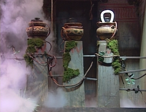 Temple GamesThe Orange Iguanas are Paula, who plays the violin and loves horses (which will come in handy for the third Temple Game), and Matt, who's been running long distances since third grade. The Purple Parrots are 12-year-old Wendy, who paints and makes crafts (she had her third-grade painting of a toucan in the Orlando Art Museum), and 11-year-old Terry, who survived being pulled under a four-foot wave. Bank Robbery (Swinging Sandbags)[]Butch Cassidy and the Sundance Kid robbed their way all across the west, while, at the same time, avoiding the law. When Kirk gave the signal, Terry and Paula had to crawl to the first block, grab the first bag of gold, crawl back to their starting block, drop it in their basket, and repeat the process with the next starting block and bag of gold. Moving back and forth, they had to avoid the swinging sandbags. If either player touched any of the swinging sandbags, they had to go back to their starting block and try again. The player with all of their bags of gold in his/her basket or the player further along in 60 seconds won. Terry beat Paula having collected three bags while she collected two bags, awarding him a half Pendant of Life. Swinging for Gold (Tilt Swing)[]For Butch and Sundance, a successful robbery might gain them a lot of gold. There is a ton of gold ripe for the picking laid out on the boards before Matt and Wendy. When Kirk gave the signal, they had to run to the gold, jump up, grab one piece each rotation, and drop it in their bins. The player with the most gold in their buckets at the end of 60 seconds won. Wendy won the game after dropping three pieces of gold, over Matt who only had two, just like her partner Terry beat Matt's partner, Paula in the previous Temple Game. She won a half Pendant of Life. Fresh Getaway Horses (Spinning Horses)[] Tiebreaker[]Olmec: "Which of these was a fast and famous mail service of the Old West—?" Matt correctly answered "Pony Express", sending him and Paula to Olmec's Temple in search of the silver horseshoe.