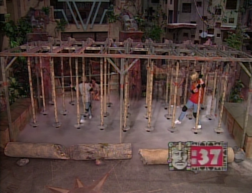 Temple GamesThe Red Jaguars are Nissa, who rides horses and wants to be an archaeologist, and Kevin, who enjoys hunting, fishing, and exploring. The Silver Snakes are Heather, who plays softball and the violin, and Casey, who plays baseball and likes riding his bike. Floating Chunks of Ice (Sinking Steps)[]The first game pitted the girls against each other in a race to find the correct path across the "floating chunks of ice" to the other side. (This was the first time the game was used, and for the first few episodes, the team players had to move in opposite directions before it was discovered that this could make the game too easy, as the later half of each player's path was made up of the first steps their opponent took— starting both players off on the same side made the game a bit fairer.) Both players had difficulty getting started, and neither made it all the way across within the time limit. With 16 seconds remaining, Nissa made it all the way to the third-to-last step before landing on a sinking step, but Heather never made it quite as far, so the first half pendant of the day went to the Red Jaguars. Backpack Grab (Swinging Foam Boulders)[]The second game required the boys to grab backpacks for the expedition up Kilimanjaro, all the while dodging a giant swinging foam boulder. Both players started off by getting the first two backpacks with no problem at all, but after that, they had a lot of trouble dodging the swinging foam boulder. Eventually, Kevin and Casey each got one more "rock," but at the end, the game was still a tie, awarding each team a half pendant. So far, the score was 1-½. Mountain Pass (Big "E" Wall)[]The third game was the vertical maze used throughout most of the show's final season; Olmec explained it as the players being chained to one another for safety's sake as they make their way around a sheer cliff to reach a mountain pass. It was a very close game, but since neither team moved all that fast, it was also close to the buzzer. With only three seconds left, the Silver Snakes made it to the mountain pass first, earning themselves a full pendant and winning the Temple Games, 1½-1.